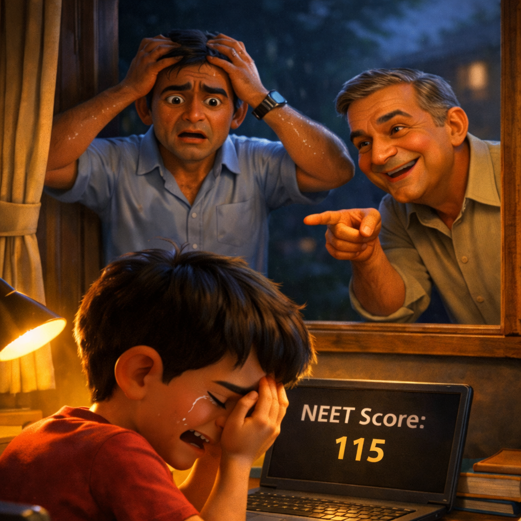 The NEET results were out, and the score was 115—far below expectations. Rahul sat in a dim room, head in his hands, tears of failure in his eyes. His father, Ravi, stood by the window with deep lines of tension on his face, wondering how he would ever afford a medical seat. Outside, their neighbor Mr. Sharma smirked and taunted them, “Give up, Ravi! MBBS is only for the elite. Why waste time on a dream that’s out of your reach?