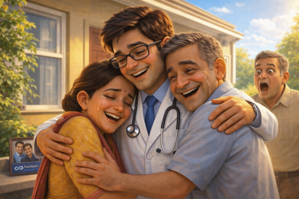 Just when the family was about to lose all hope, an old friend—a senior, successful Doctor—visited. He placed a hand on Rahul’s shoulder and turned to Ravi. “Don’t let a single scorecard define his future. You need the right guidance. Take him to Pandayan Infinity Education Research Studies India. They are experts in securing Doctor admissions for students with low scores.”